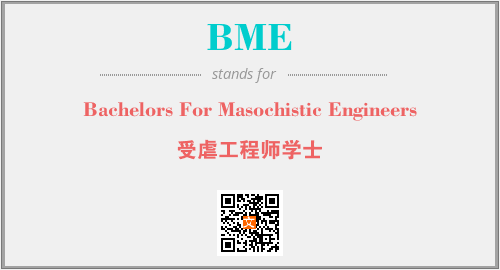 英文缩略词“BME”经常作为“Bachelors For Masochistic Engineers”的英文缩写来使用,中文表示:“受虐工程师学士”。本文将详细介绍英文缩写词BME所代表英文单词,其对应的中文拼音、详细解释以及在英语中的流行度。此外,还有关于缩略词BME的分类、应用领域及相关应用示例等。