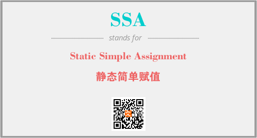 英文缩略词“SSA”经常作为“Static Simple Assignment”的英文缩写来使用,中文表示:“静态简单赋值”。本文将详细介绍英文缩写词SSA所代表英文单词,其对应的中文拼音、详细解释以及在英语中的流行度。此外,还有关于缩略词SSA的分类、应用领域及相关应用示例等。