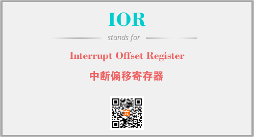 上述内容是“Interrupt Offset Register”作为“IOR”的缩写,解释为“中断偏移寄存器”时的信息,以及英文缩略词IOR所代表的英文单词,其对应的中文拼音、详细解释以及在英文中的流行度和相关分类、应用领域及应用示例等。