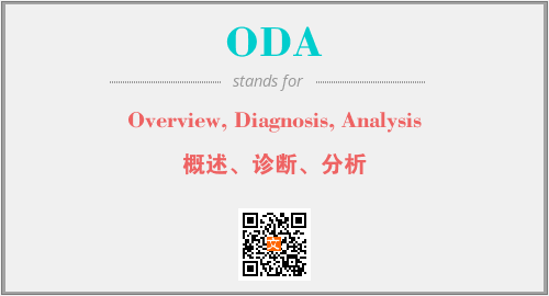 上述内容是“Overview, Diagnosis, Analysis”作为“ODA”的缩写,解释为“概述、诊断、分析”时的信息,以及英文缩略词ODA所代表的英文单词,其对应的中文拼音、详细解释以及在英文中的流行度和相关分类、应用领域及应用示例等。