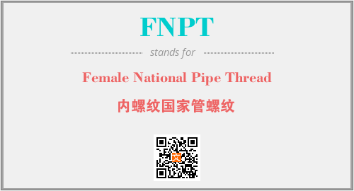 英文缩略词“FNPT”经常作为“Female National Pipe Thread”的英文缩写来使用,中文表示:“内螺纹国家管螺纹”。本文将详细介绍英文缩写词FNPT所代表英文单词,其对应的中文拼音、详细解释以及在英语中的流行度。此外,还有关于缩略词FNPT的分类、应用领域及相关应用示例等。