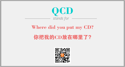 英文缩略词“QCD”经常作为“Where did you put my CD?”的英文缩写来使用,中文表示:“你把我的CD放在哪里了?”。本文将详细介绍英文缩写词QCD所代表英文单词,其对应的中文拼音、详细解释以及在英语中的流行度。此外,还有关于缩略词QCD的分类、应用领域及相关应用示例等。