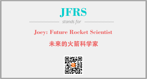 上述内容是“Joey: Future Rocket Scientist”作为“JFRS”的缩写,解释为“未来的火箭科学家”时的信息,以及英文缩略词JFRS所代表的英文单词,其对应的中文拼音、详细解释以及在英文中的流行度和相关分类、应用领域及应用示例等。
