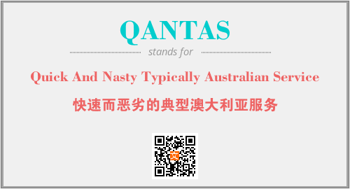 上述内容是“Quick And Nasty Typically Australian Service”作为“QANTAS”的缩写,解释为“快速而恶劣的典型澳大利亚服务”时的信息,以及英文缩略词QANTAS所代表的英文单词,其对应的中文拼音、详细解释以及在英文中的流行度和相关分类、应用领域及应用示例等。