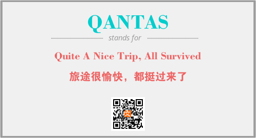 上述内容是“Quite A Nice Trip, All Survived”作为“QANTAS”的缩写,解释为“旅途很愉快,都挺过来了”时的信息,以及英文缩略词QANTAS所代表的英文单词,其对应的中文拼音、详细解释以及在英文中的流行度和相关分类、应用领域及应用示例等。