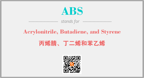 英文缩略词“ABS”经常作为“Acrylonitrile, Butadiene, and Styrene”的英文缩写来使用,中文表示:“丙烯腈、丁二烯和苯乙烯”。本文将详细介绍英文缩写词ABS所代表英文单词,其对应的中文拼音、详细解释以及在英语中的流行度。此外,还有关于缩略词ABS的分类、应用领域及相关应用示例等。