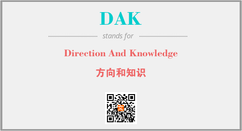 上述内容是“Direction And Knowledge”作为“DAK”的缩写,解释为“方向和知识”时的信息,以及英文缩略词DAK所代表的英文单词,其对应的中文拼音、详细解释以及在英文中的流行度和相关分类、应用领域及应用示例等。