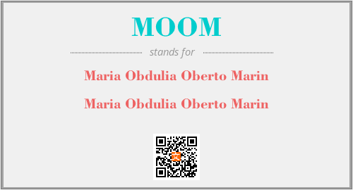 上述内容是“Maria Obdulia Oberto Marin”作为“MOOM”的缩写,解释为“Maria Obdulia Oberto Marin”时的信息,以及英文缩略词MOOM所代表的英文单词,其对应的中文拼音、详细解释以及在英文中的流行度和相关分类、应用领域及应用示例等。