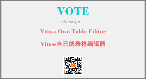 英文缩略词“VOTE”经常作为“Vituss Own Table Editor”的英文缩写来使用,中文表示:“Vituss自己的表格编辑器”。本文将详细介绍英文缩写词VOTE所代表英文单词,其对应的中文拼音、详细解释以及在英语中的流行度。此外,还有关于缩略词VOTE的分类、应用领域及相关应用示例等。