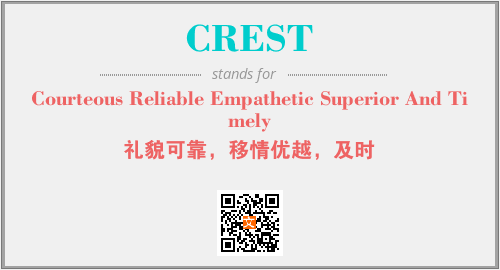 上述内容是“Courteous Reliable Empathetic Superior And Timely”作为“CREST”的缩写,解释为“礼貌可靠,移情优越,及时”时的信息,以及英文缩略词CREST所代表的英文单词,其对应的中文拼音、详细解释以及在英文中的流行度和相关分类、应用领域及应用示例等。