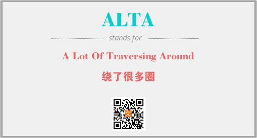 上述内容是“A Lot Of Traversing Around”作为“ALTA”的缩写,解释为“绕了很多圈”时的信息,以及英文缩略词ALTA所代表的英文单词,其对应的中文拼音、详细解释以及在英文中的流行度和相关分类、应用领域及应用示例等。