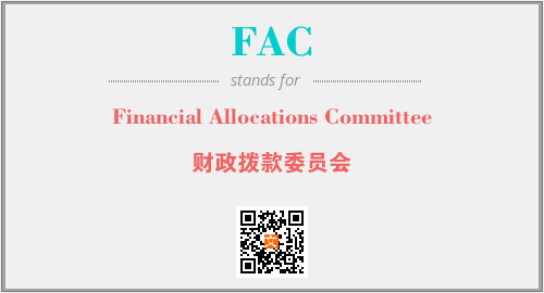 上述内容是“Financial Allocations Committee”作为“FAC”的缩写,解释为“财政拨款委员会”时的信息,以及英文缩略词FAC所代表的英文单词,其对应的中文拼音、详细解释以及在英文中的流行度和相关分类、应用领域及应用示例等。
