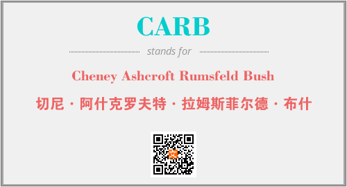 上述内容是“Cheney Ashcroft Rumsfeld Bush”作为“CARB”的缩写,解释为“切尼·阿什克罗夫特·拉姆斯菲尔德·布什”时的信息,以及英文缩略词CARB所代表的英文单词,其对应的中文拼音、详细解释以及在英文中的流行度和相关分类、应用领域及应用示例等。