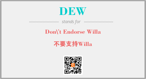 上述内容是“Don\'t Endorse Willa”作为“DEW”的缩写,解释为“不要支持Willa”时的信息,以及英文缩略词DEW所代表的英文单词,其对应的中文拼音、详细解释以及在英文中的流行度和相关分类、应用领域及应用示例等。