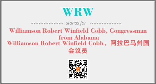 上述内容是“Williamson Robert Winfield Cobb, Congressman from Alabama”作为“WRW”的缩写,解释为“Williamson Robert Winfield Cobb,阿拉巴马州国会议员”时的信息,以及英文缩略词WRW所代表的英文单词,其对应的中文拼音、详细解释以及在英文中的流行度和相关分类、应用领域及应用示例等。
