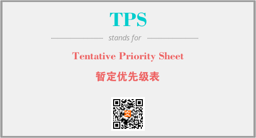 上述内容是“Tentative Priority Sheet”作为“TPS”的缩写,解释为“暂定优先级表”时的信息,以及英文缩略词TPS所代表的英文单词,其对应的中文拼音、详细解释以及在英文中的流行度和相关分类、应用领域及应用示例等。