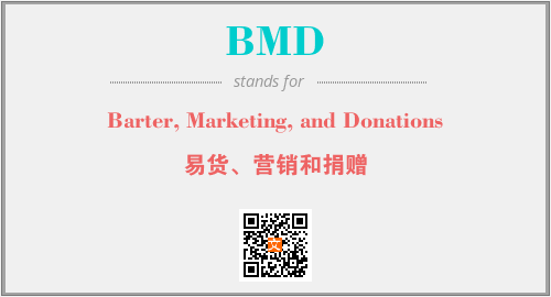 上述内容是“Barter, Marketing, and Donations”作为“BMD”的缩写,解释为“易货、营销和捐赠”时的信息,以及英文缩略词BMD所代表的英文单词,其对应的中文拼音、详细解释以及在英文中的流行度和相关分类、应用领域及应用示例等。