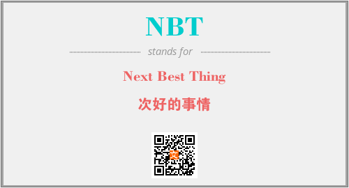 英文缩略词“NBT”经常作为“Next Best Thing”的英文缩写来使用,中文表示:“次好的事情”。本文将详细介绍英文缩写词NBT所代表英文单词,其对应的中文拼音、详细解释以及在英语中的流行度。此外,还有关于缩略词NBT的分类、应用领域及相关应用示例等。