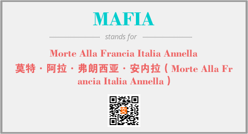 以上为Morte Alla Francia Italia Annella英文缩略词MAFIA的中文解释,以及该英文缩写在英语的流行度、分类和应用领域方面的信息。