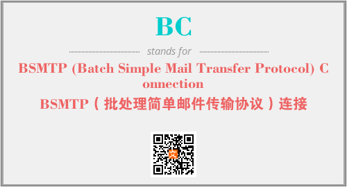 上述内容是“BSMTP (Batch Simple Mail Transfer Protocol) Connection”作为“BC”的缩写,解释为“BSMTP(批处理简单邮件传输协议)连接”时的信息,以及英文缩略词BC所代表的英文单词,其对应的中文拼音、详细解释以及在英文中的流行度和相关分类、应用领域及应用示例等。
