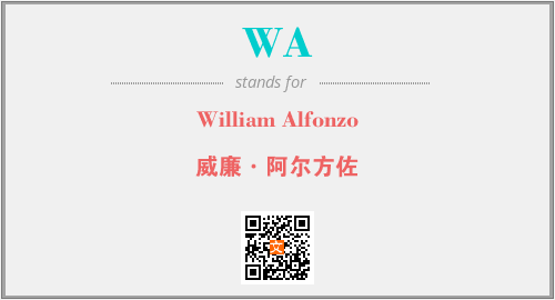 上述内容是“William Alfonzo”作为“WA”的缩写,解释为“威廉·阿尔方佐”时的信息,以及英文缩略词WA所代表的英文单词,其对应的中文拼音、详细解释以及在英文中的流行度和相关分类、应用领域及应用示例等。