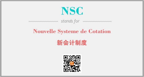 上述内容是“Nouvelle Systeme de Cotation”作为“NSC”的缩写,解释为“新会计制度”时的信息,以及英文缩略词NSC所代表的英文单词,其对应的中文拼音、详细解释以及在英文中的流行度和相关分类、应用领域及应用示例等。