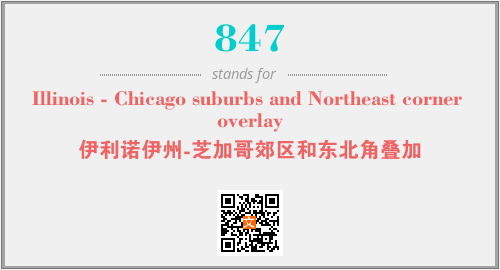 上述内容是“Illinois - Chicago suburbs and Northeast corner overlay”作为“847”的缩写,解释为“伊利诺伊州-芝加哥郊区和东北角叠加”时的信息,以及英文缩略词847所代表的英文单词,其对应的中文拼音、详细解释以及在英文中的流行度和相关分类、应用领域及应用示例等。