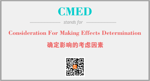 上述内容是“Consideration For Making Effects Determination”作为“CMED”的缩写,解释为“确定影响的考虑因素”时的信息,以及英文缩略词CMED所代表的英文单词,其对应的中文拼音、详细解释以及在英文中的流行度和相关分类、应用领域及应用示例等。