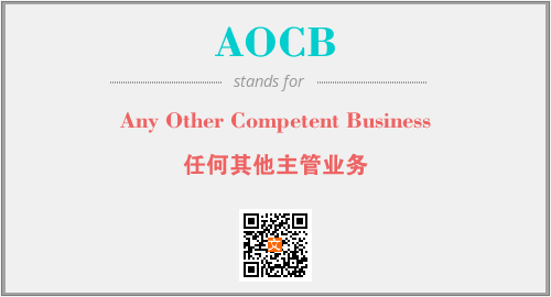 英文缩略词“AOCB”经常作为“Any Other Competent Business”的英文缩写来使用,中文表示:“任何其他主管业务”。本文将详细介绍英文缩写词AOCB所代表英文单词,其对应的中文拼音、详细解释以及在英语中的流行度。此外,还有关于缩略词AOCB的分类、应用领域及相关应用示例等。