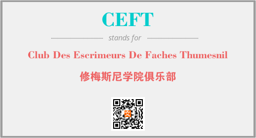 上述内容是“Club Des Escrimeurs De Faches Thumesnil”作为“CEFT”的缩写,解释为“修梅斯尼学院俱乐部”时的信息,以及英文缩略词CEFT所代表的英文单词,其对应的中文拼音、详细解释以及在英文中的流行度和相关分类、应用领域及应用示例等。