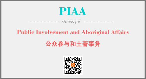 上述内容是“Public Involvement and Aboriginal Affairs”作为“PIAA”的缩写,解释为“公众参与和土著事务”时的信息,以及英文缩略词PIAA所代表的英文单词,其对应的中文拼音、详细解释以及在英文中的流行度和相关分类、应用领域及应用示例等。