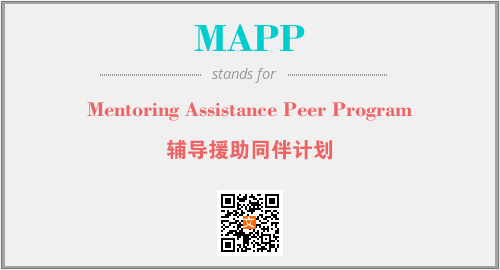 英文缩略词“MAPP”经常作为“Mentoring Assistance Peer Program”的英文缩写来使用,中文表示:“辅导援助同伴计划”。本文将详细介绍英文缩写词MAPP所代表英文单词,其对应的中文拼音、详细解释以及在英语中的流行度。此外,还有关于缩略词MAPP的分类、应用领域及相关应用示例等。
