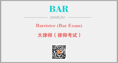英文缩略词“BAR”经常作为“Barrister (Bar Exam)”的英文缩写来使用,中文表示:“大律师(律师考试)”。本文将详细介绍英文缩写词BAR所代表英文单词,其对应的中文拼音、详细解释以及在英语中的流行度。此外,还有关于缩略词BAR的分类、应用领域及相关应用示例等。