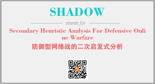 上述内容是“Secondary Heuristic Analysis For Defensive Online Warfare”作为“SHADOW”的缩写,解释为“防御型网络战的二次启发式分析”时的信息,以及英文缩略词SHADOW所代表的英文单词,其对应的中文拼音、详细解释以及在英文中的流行度和相关分类、应用领域及应用示例等。