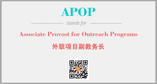 上述内容是“Associate Provost for Outreach Programs”作为“APOP”的缩写,解释为“外联项目副教务长”时的信息,以及英文缩略词APOP所代表的英文单词,其对应的中文拼音、详细解释以及在英文中的流行度和相关分类、应用领域及应用示例等。