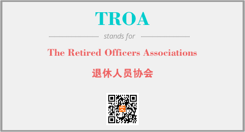 英文缩略词“TROA”经常作为“The Retired Officers Associations”的英文缩写来使用,中文表示:“退休人员协会”。本文将详细介绍英文缩写词TROA所代表英文单词,其对应的中文拼音、详细解释以及在英语中的流行度。此外,还有关于缩略词TROA的分类、应用领域及相关应用示例等。