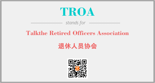 上述内容是“Talkthe Retired Officers Association”作为“TROA”的缩写,解释为“退休人员协会”时的信息,以及英文缩略词TROA所代表的英文单词,其对应的中文拼音、详细解释以及在英文中的流行度和相关分类、应用领域及应用示例等。