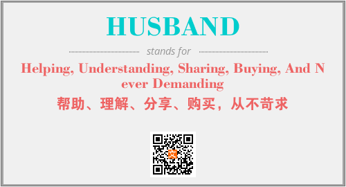 上述内容是“Helping, Understanding, Sharing, Buying, And Never Demanding”作为“HUSBAND”的缩写,解释为“帮助、理解、分享、购买,从不苛求”时的信息,以及英文缩略词HUSBAND所代表的英文单词,其对应的中文拼音、详细解释以及在英文中的流行度和相关分类、应用领域及应用示例等。