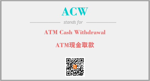 英文缩略词“ACW”经常作为“ATM Cash Withdrawal”的英文缩写来使用,中文表示:“ATM现金取款”。本文将详细介绍英文缩写词ACW所代表英文单词,其对应的中文拼音、详细解释以及在英语中的流行度。此外,还有关于缩略词ACW的分类、应用领域及相关应用示例等。