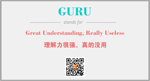 上述内容是“Great Understanding, Really Useless”作为“GURU”的缩写,解释为“理解力很强,真的没用”时的信息,以及英文缩略词GURU所代表的英文单词,其对应的中文拼音、详细解释以及在英文中的流行度和相关分类、应用领域及应用示例等。