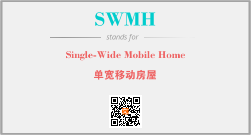 英文缩略词“SWMH”经常作为“Single-Wide Mobile Home”的英文缩写来使用,中文表示:“单宽移动房屋”。本文将详细介绍英文缩写词SWMH所代表英文单词,其对应的中文拼音、详细解释以及在英语中的流行度。此外,还有关于缩略词SWMH的分类、应用领域及相关应用示例等。