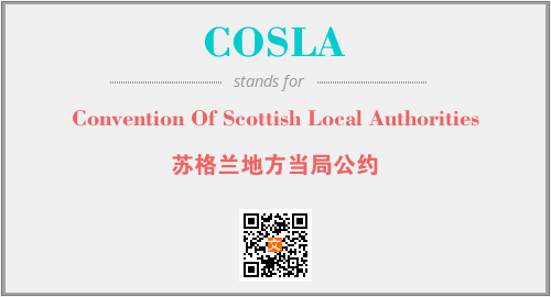 英文缩略词“COSLA”经常作为“Convention Of Scottish Local Authorities”的英文缩写来使用,中文表示:“苏格兰地方当局公约”。本文将详细介绍英文缩写词COSLA所代表英文单词,其对应的中文拼音、详细解释以及在英语中的流行度。此外,还有关于缩略词COSLA的分类、应用领域及相关应用示例等。