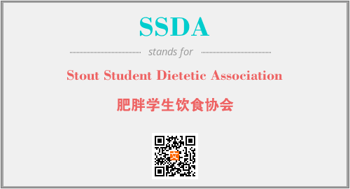上述内容是“Stout Student Dietetic Association”作为“SSDA”的缩写,解释为“肥胖学生饮食协会”时的信息,以及英文缩略词SSDA所代表的英文单词,其对应的中文拼音、详细解释以及在英文中的流行度和相关分类、应用领域及应用示例等。