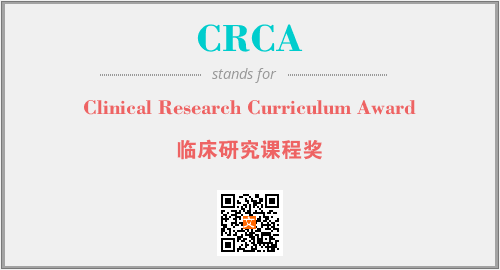 英文缩略词“CRCA”经常作为“Clinical Research Curriculum Award”的英文缩写来使用,中文表示:“临床研究课程奖”。本文将详细介绍英文缩写词CRCA所代表英文单词,其对应的中文拼音、详细解释以及在英语中的流行度。此外,还有关于缩略词CRCA的分类、应用领域及相关应用示例等。