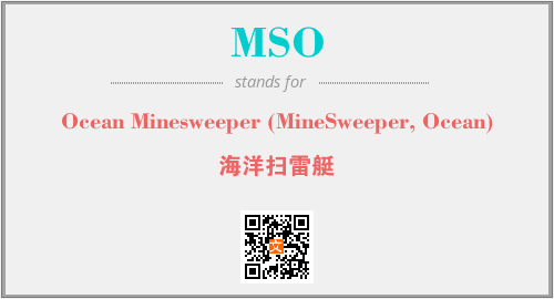 英文缩略词“MSO”经常作为“Ocean Minesweeper (MineSweeper, Ocean)”的英文缩写来使用,中文表示:“海洋扫雷艇”。本文将详细介绍英文缩写词MSO所代表英文单词,其对应的中文拼音、详细解释以及在英语中的流行度。此外,还有关于缩略词MSO的分类、应用领域及相关应用示例等。