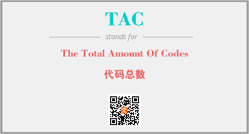 英文缩略词“TAC”经常作为“The Total Amount Of Codes”的英文缩写来使用,中文表示:“代码总数”。本文将详细介绍英文缩写词TAC所代表英文单词,其对应的中文拼音、详细解释以及在英语中的流行度。此外,还有关于缩略词TAC的分类、应用领域及相关应用示例等。