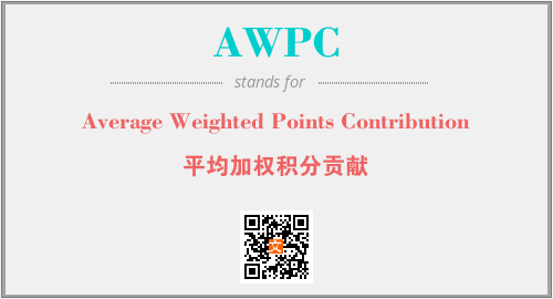 上述内容是“Average Weighted Points Contribution”作为“AWPC”的缩写,解释为“平均加权积分贡献”时的信息,以及英文缩略词AWPC所代表的英文单词,其对应的中文拼音、详细解释以及在英文中的流行度和相关分类、应用领域及应用示例等。