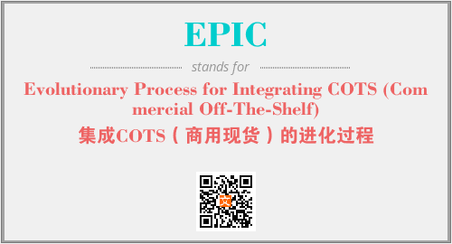 上述内容是“Evolutionary Process for Integrating COTS (Commercial Off-The-Shelf)”作为“EPIC”的缩写,解释为“集成COTS(商用现货)的进化过程”时的信息,以及英文缩略词EPIC所代表的英文单词,其对应的中文拼音、详细解释以及在英文中的流行度和相关分类、应用领域及应用示例等。