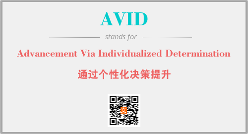 上述内容是“Advancement Via Individualized Determination”作为“AVID”的缩写,解释为“通过个性化决策提升”时的信息,以及英文缩略词AVID所代表的英文单词,其对应的中文拼音、详细解释以及在英文中的流行度和相关分类、应用领域及应用示例等。