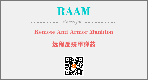 英文缩略词“RAAM”经常作为“Remote Anti Armor Munition”的英文缩写来使用,中文表示:“远程反装甲弹药”。本文将详细介绍英文缩写词RAAM所代表英文单词,其对应的中文拼音、详细解释以及在英语中的流行度。此外,还有关于缩略词RAAM的分类、应用领域及相关应用示例等。